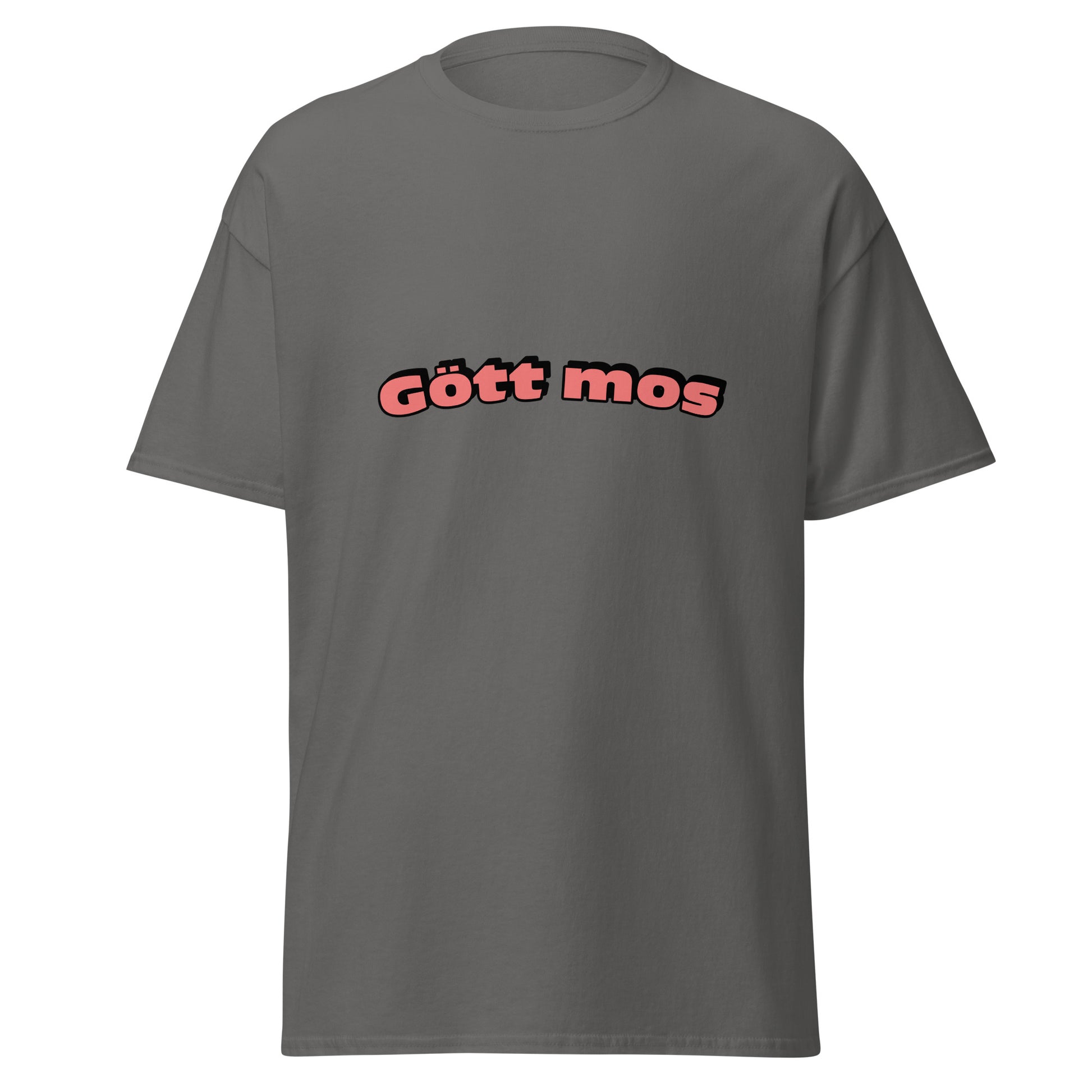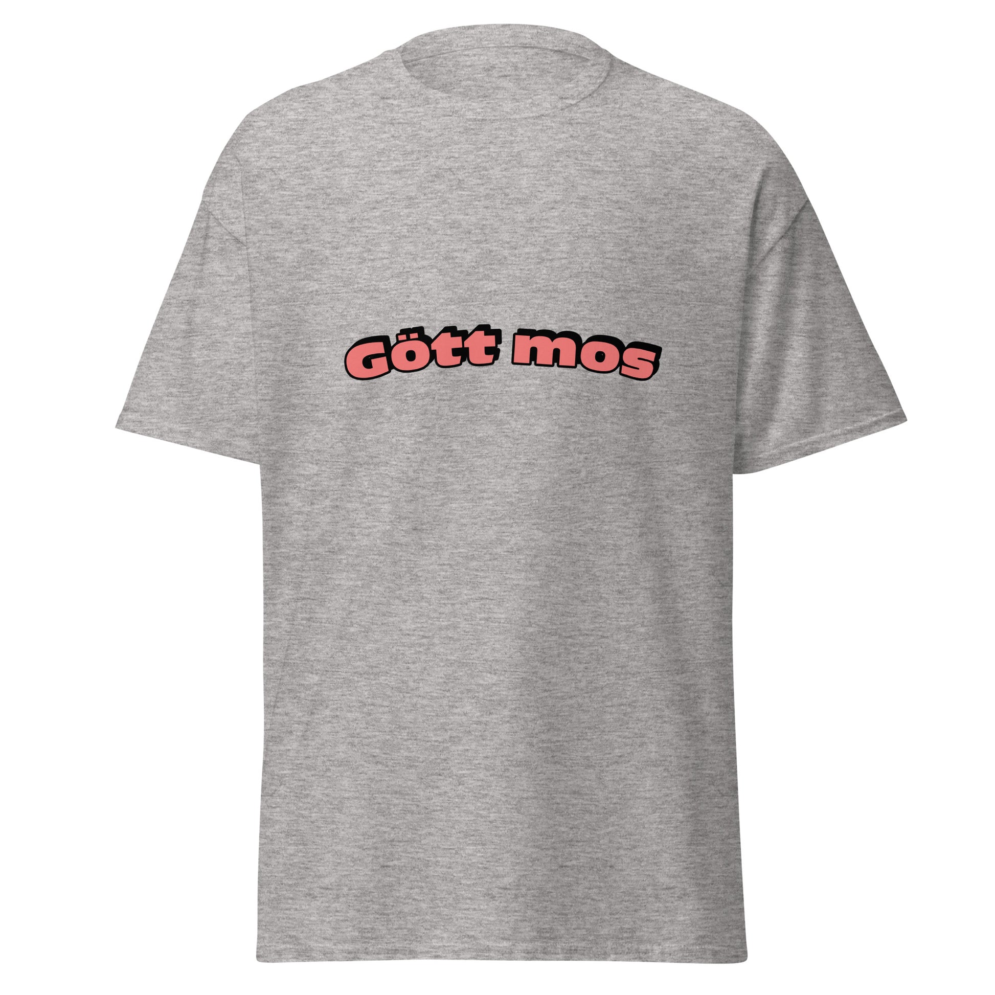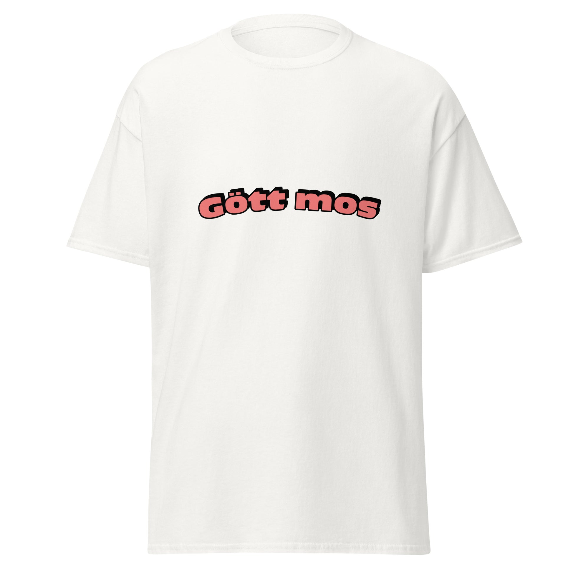 T-shirten har texten "Gött Mos" tryckt med stora, tydliga bokstäver som är både roliga och stilrena. Designen är enkel men kraftfull, och trycket är gjort med miljövänliga färger som är skonsamma för både dig och naturen.