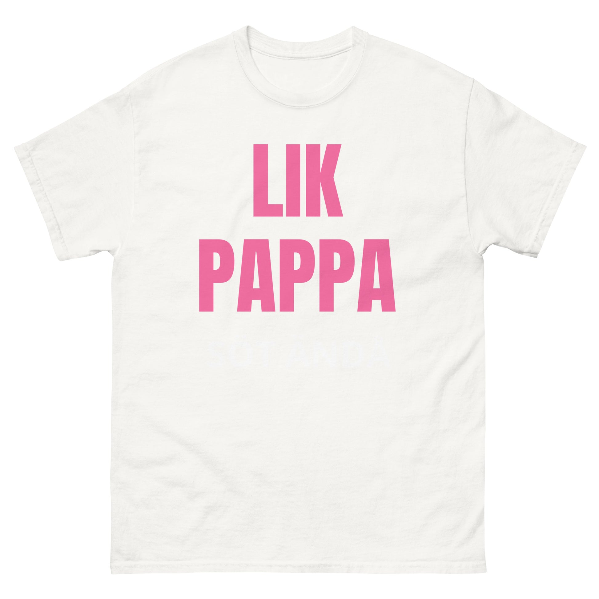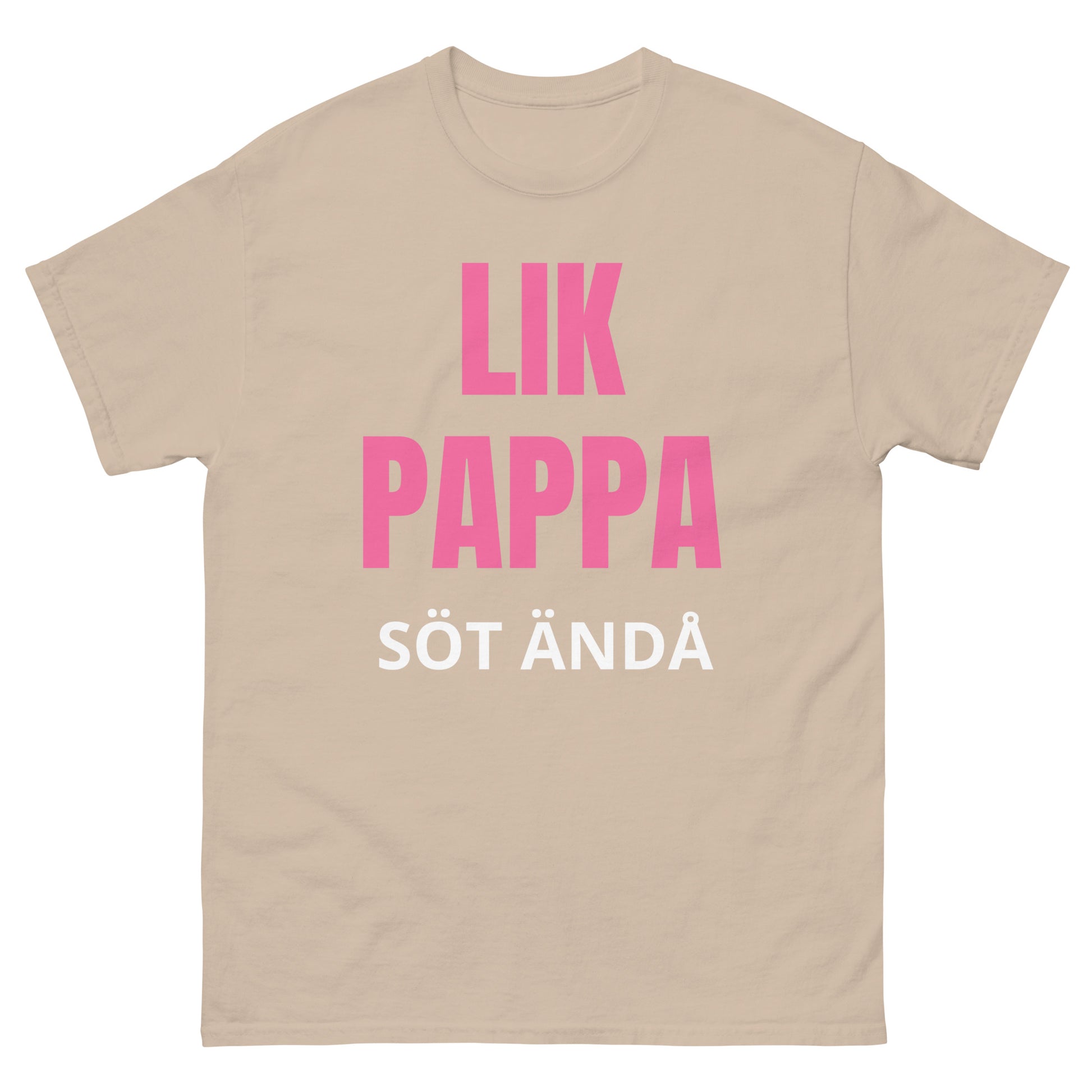 Upptäck vår roliga T-shirt med texten "lik pappa söt ändå". Perfekt present till pappa och barn. Hög kvalitet, bekväm passform och unik design. Beställ nu!