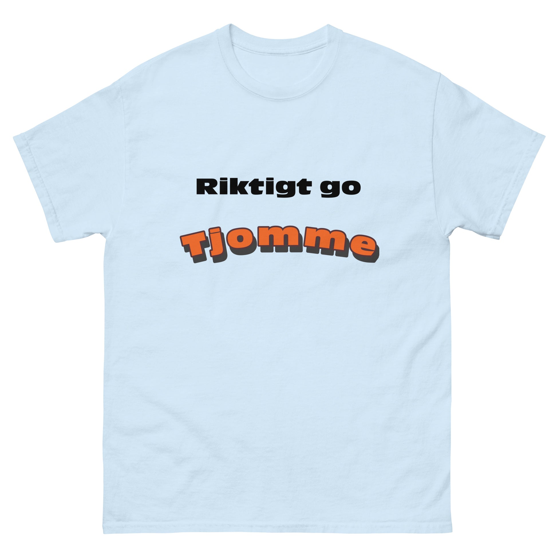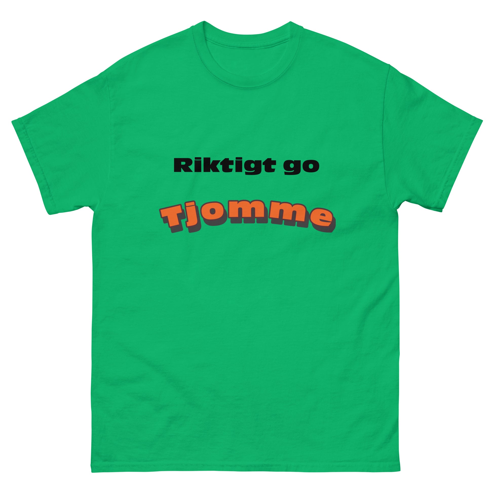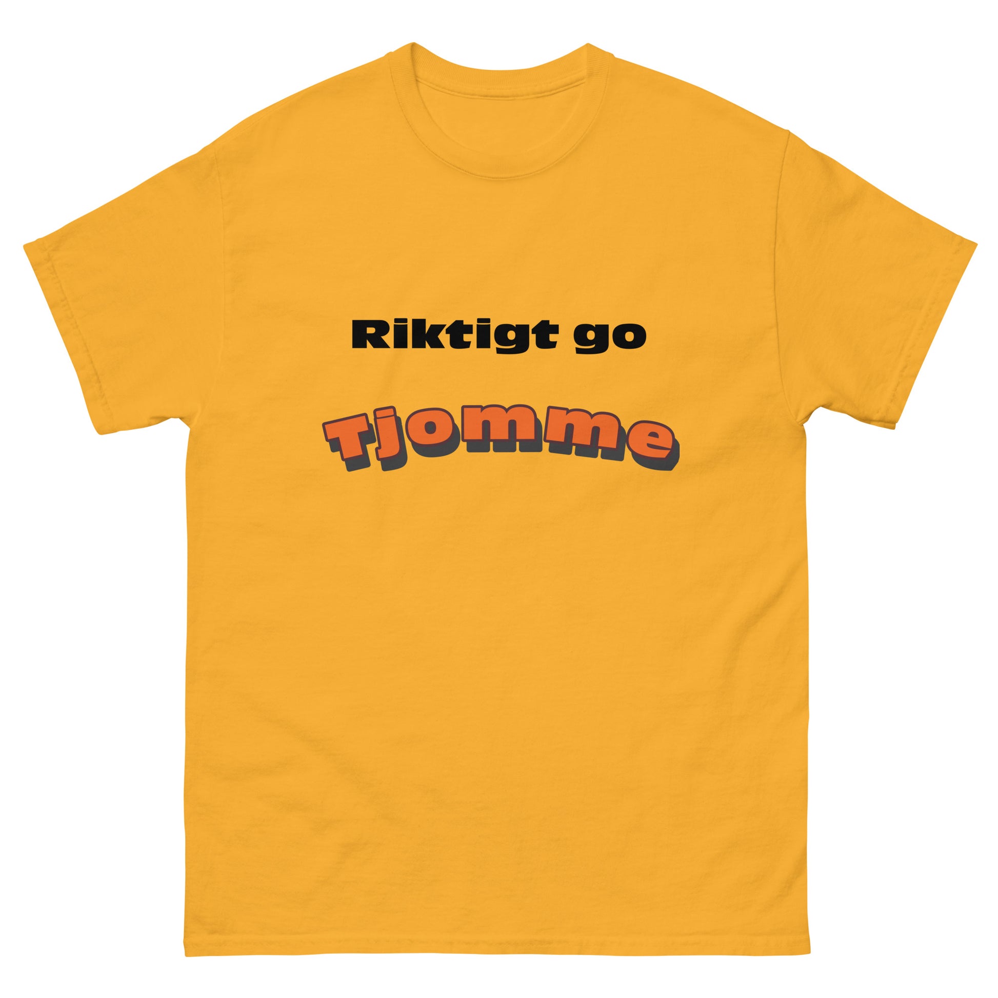 T-shirten har texten "Riktigt Go Tjomme" tryckt med stora, tydliga bokstäver som är både roliga och stilrena. Designen är enkel men kraftfull, och trycket är gjort med miljövänliga färger som är skonsamma för både dig och naturen. Den humoristiska texten med sin göteborgska touch är perfekt för alla som älskar en god skratt och lite skön göteborgshumor.