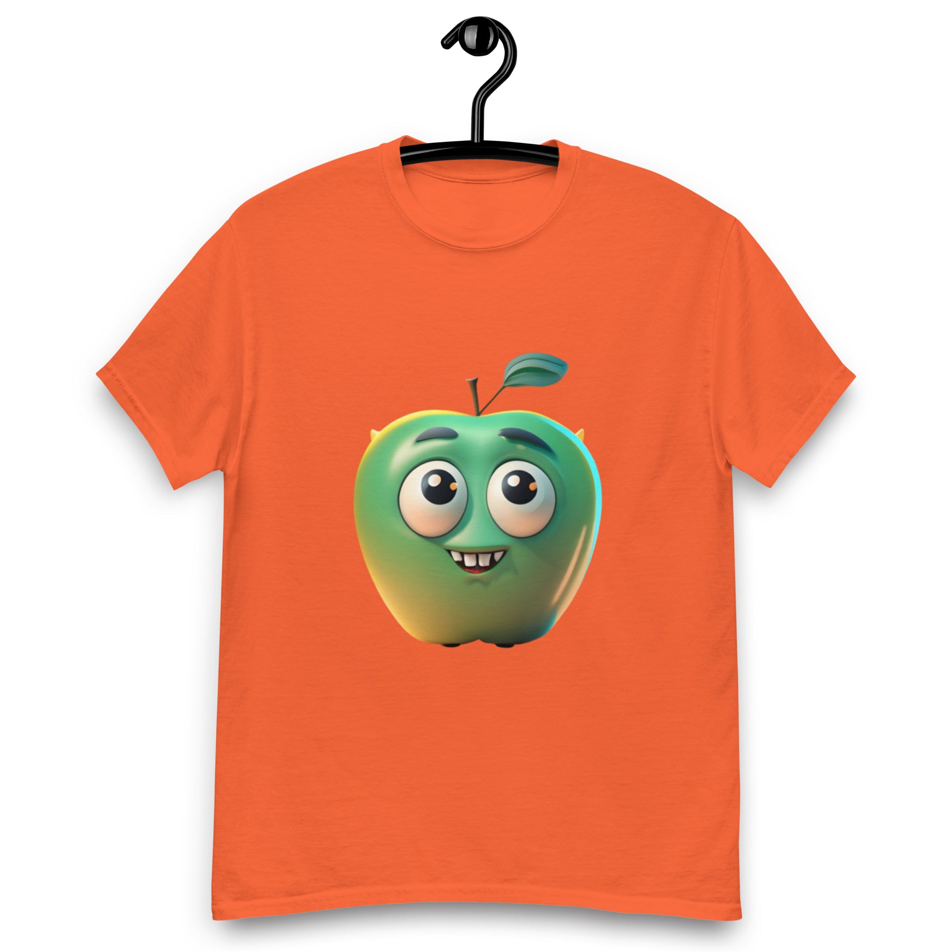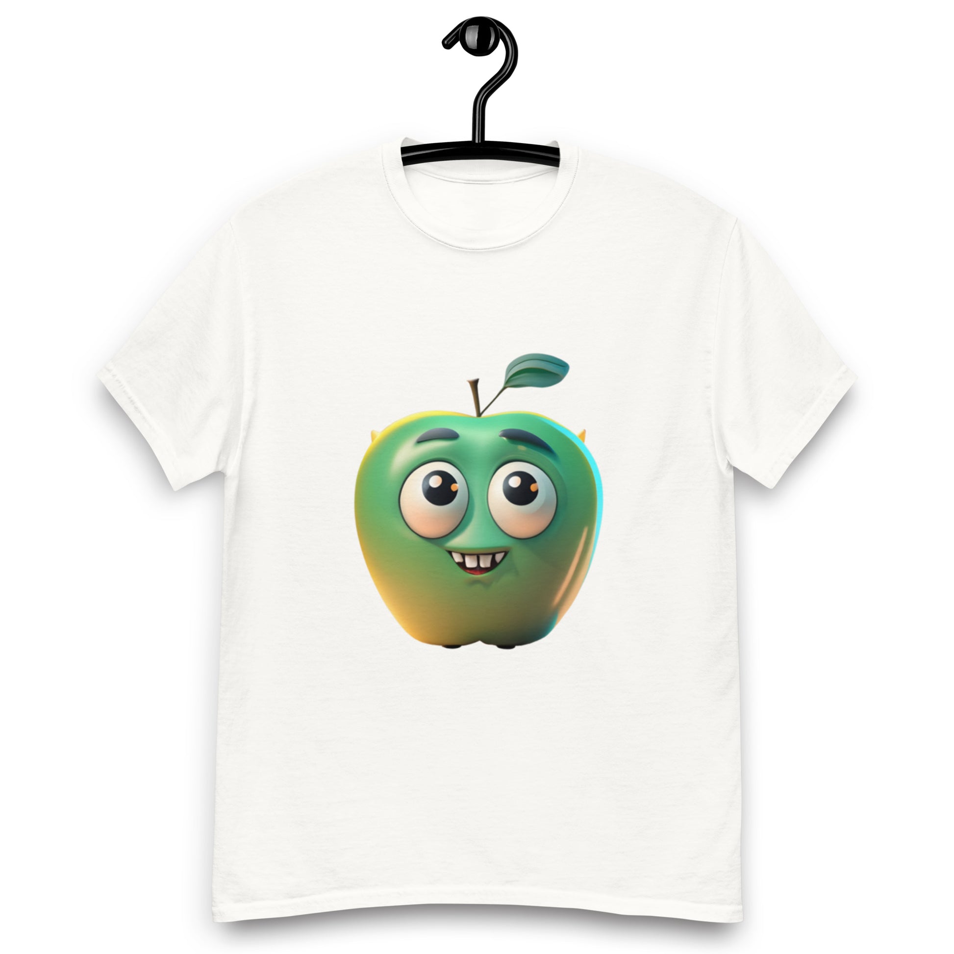 Det gröna animerade äpplet är tecknat med starka konturer och roliga detaljer som gör att det ser levande ut på t-shirten. Den färgglada och fantasifulla designen skapar ett roligt och energiskt intryck, och fångar blickarna direkt.