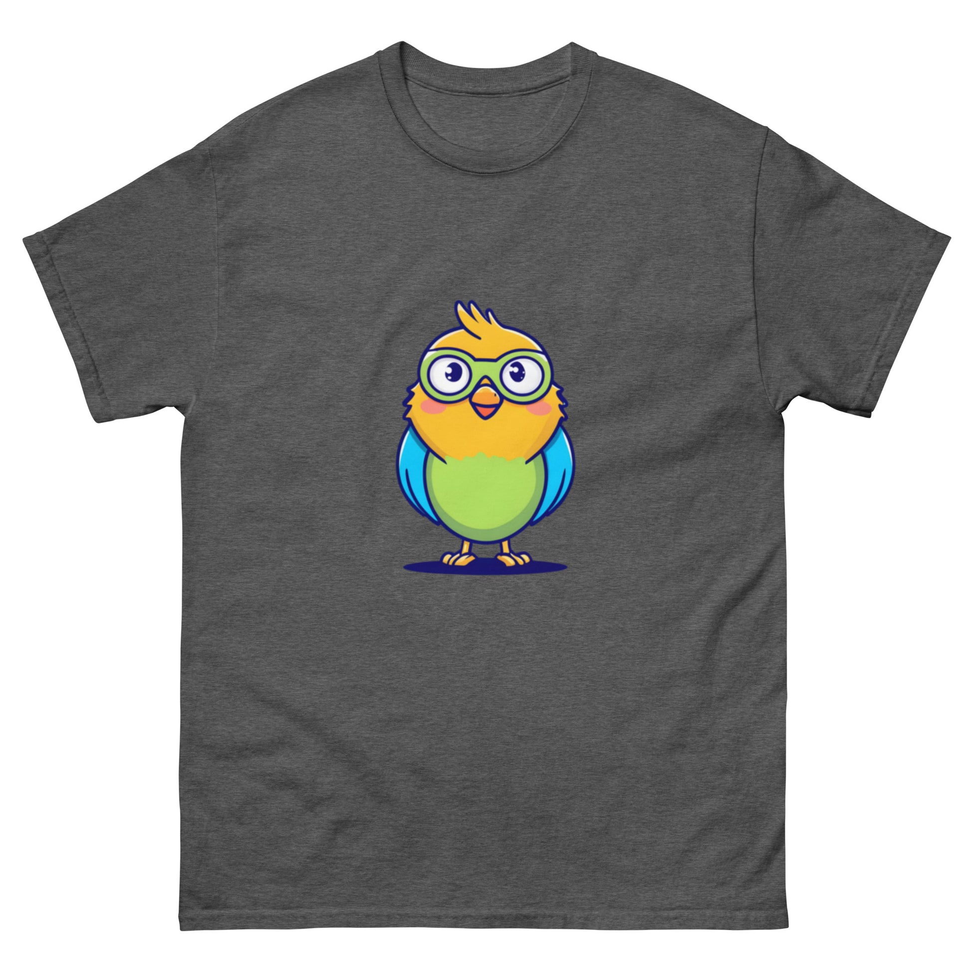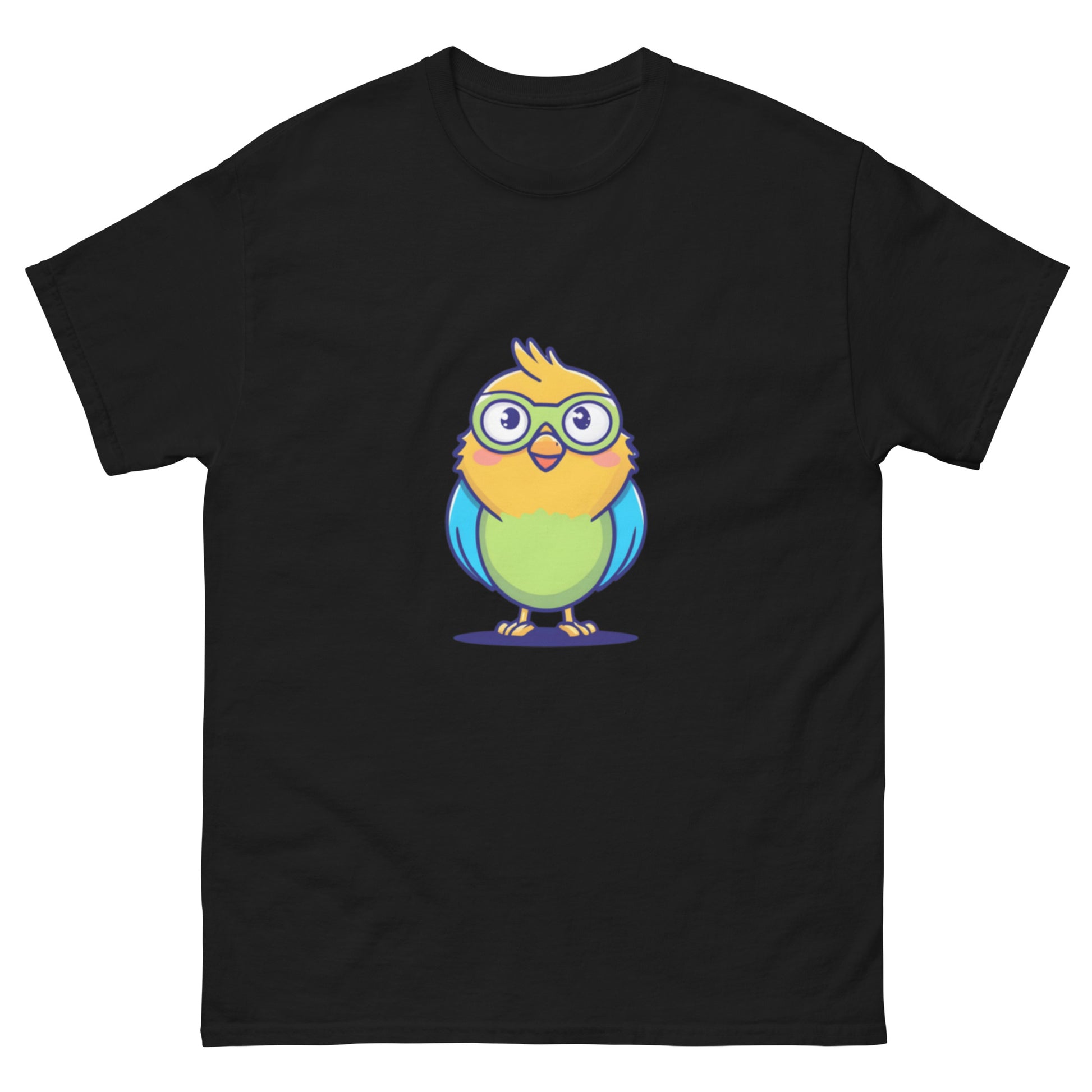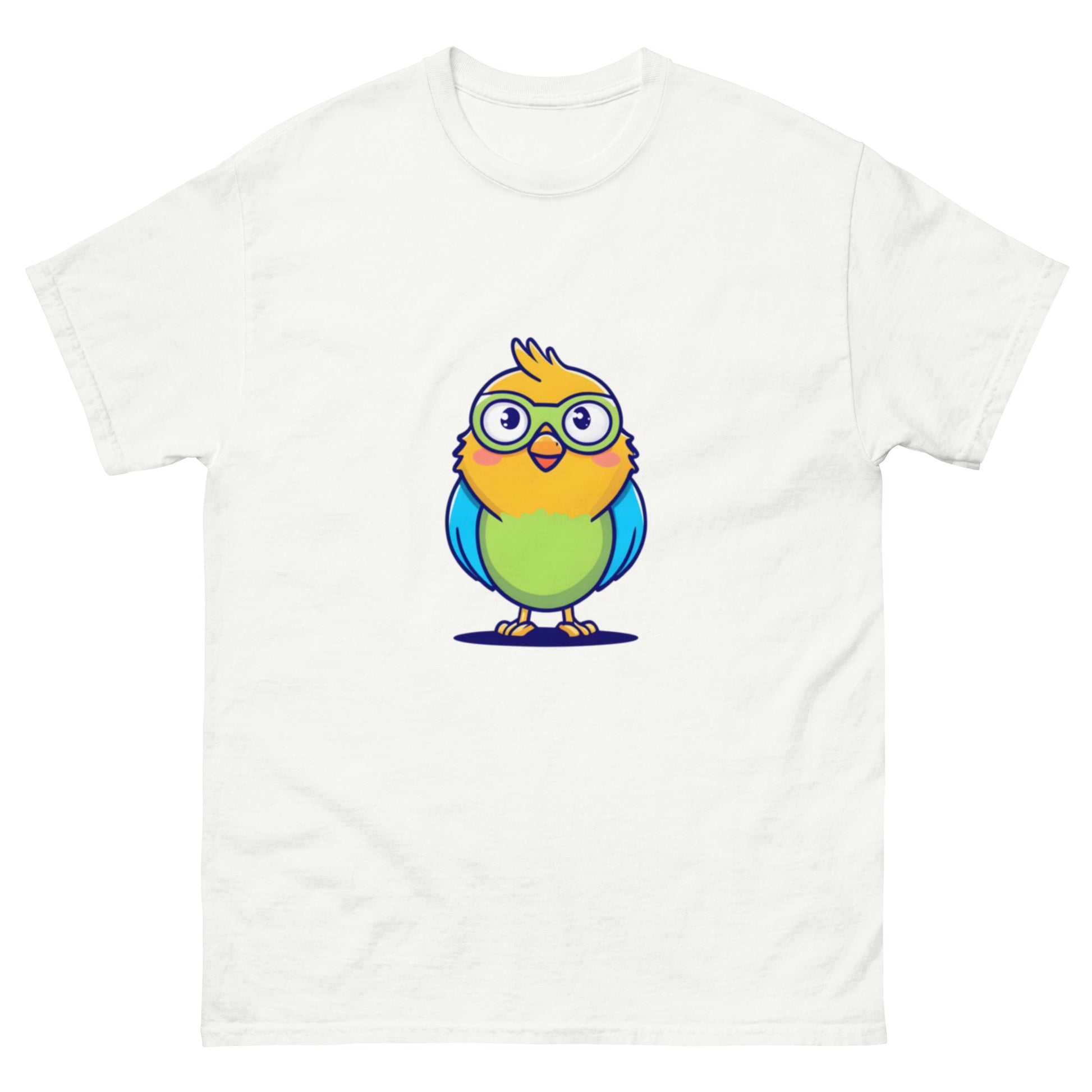 Trött på vanliga, tråkiga T-shirts? Vi har den perfekta lösningen! Med ett motiv av en tecknad fågel med glasögon är denna T-shirt både rolig och stilsäker. Den lilla fågeln med sina runda, söta glasögon ger en känsla av smart lekfullhet som passar alla som vill visa sin humoristiska sida. En sådan unik design garanterar att du fångar uppmärksamheten oavsett var du går.
