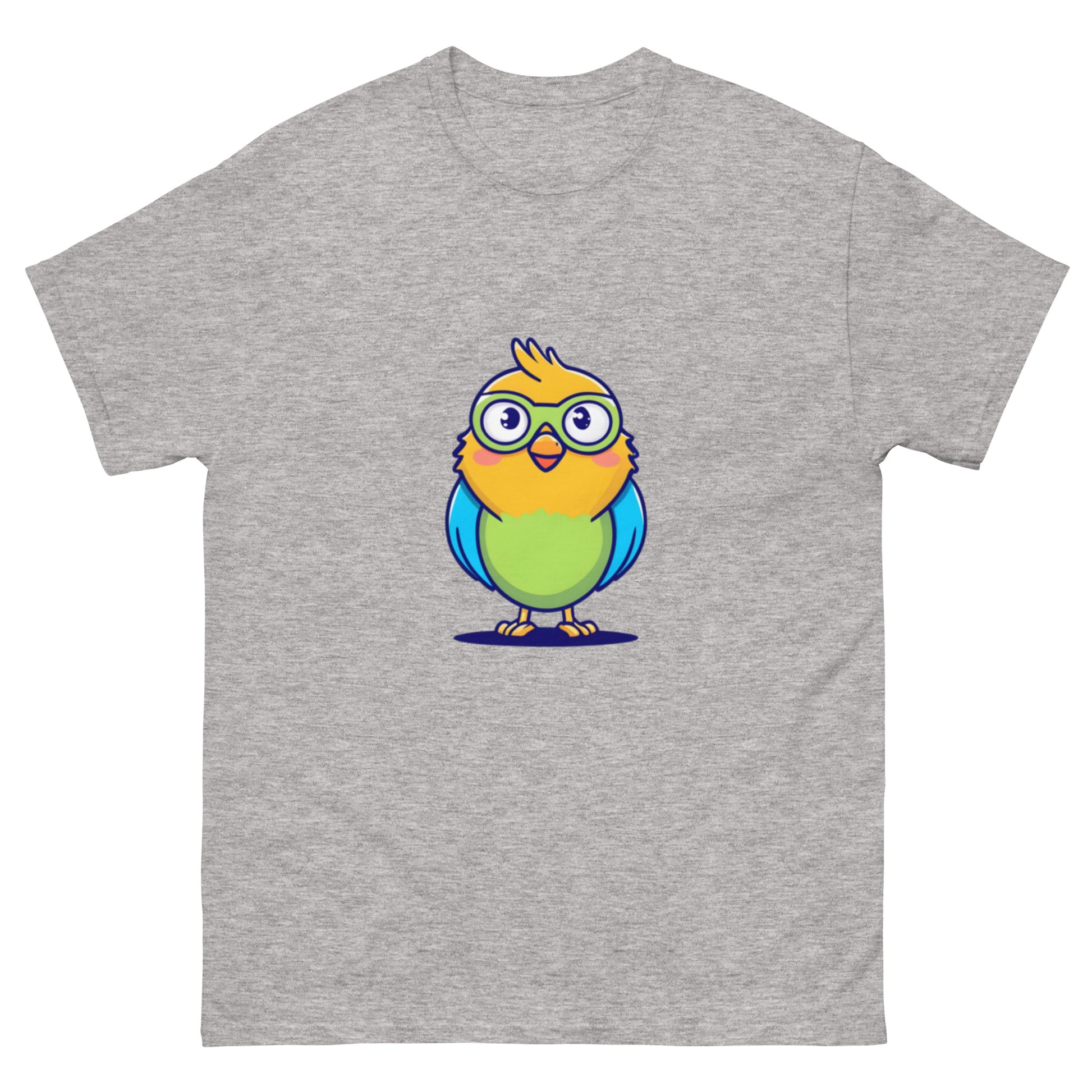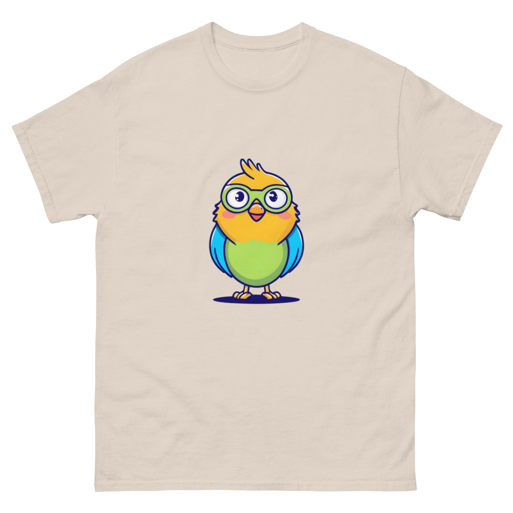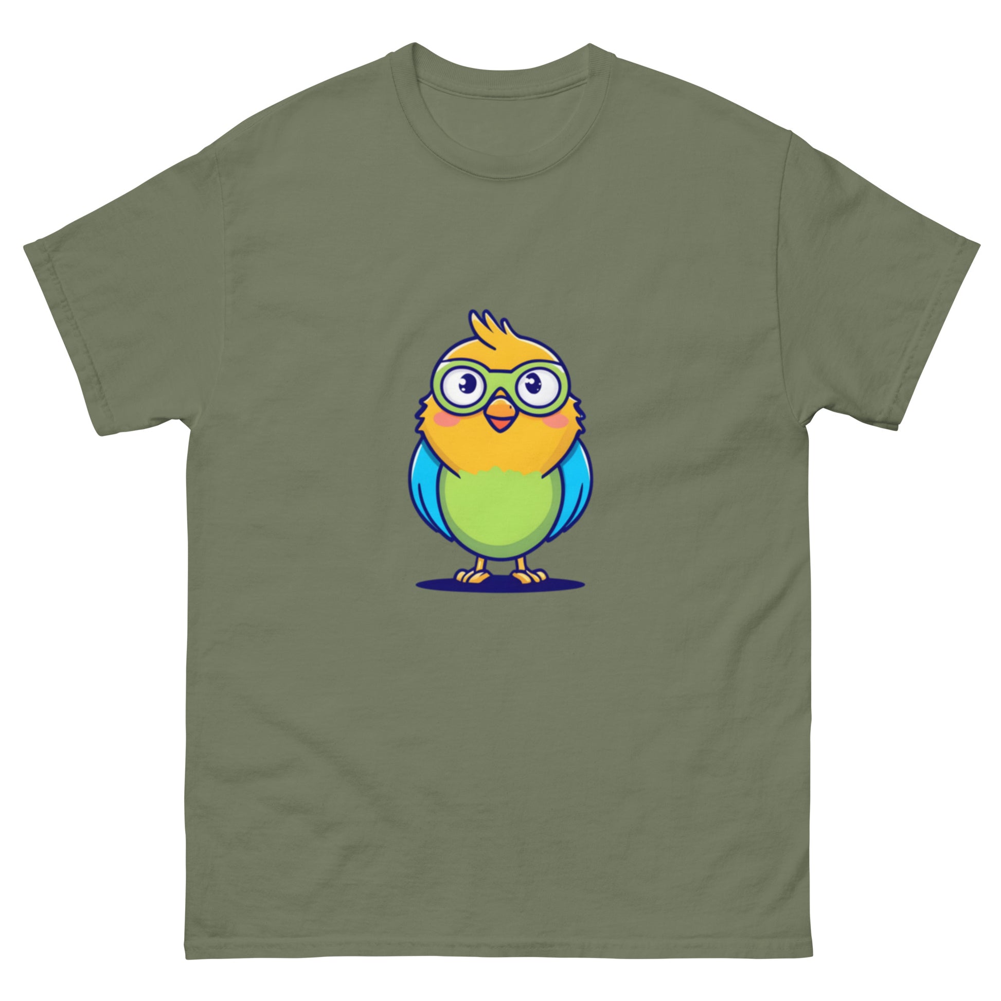 Trött på vanliga, tråkiga T-shirts? Vi har den perfekta lösningen! Med ett motiv av en tecknad fågel med glasögon är denna T-shirt både rolig och stilsäker. Den lilla fågeln med sina runda, söta glasögon ger en känsla av smart lekfullhet som passar alla som vill visa sin humoristiska sida. En sådan unik design garanterar att du fångar uppmärksamheten oavsett var du går.