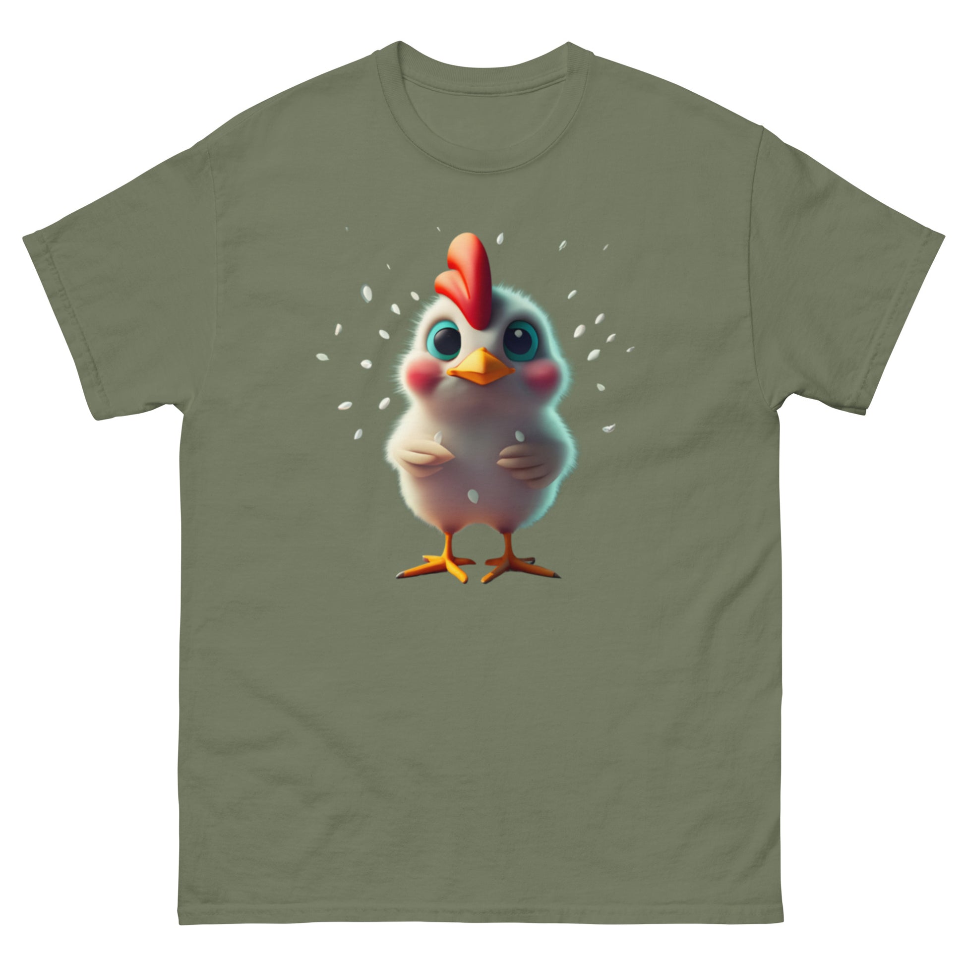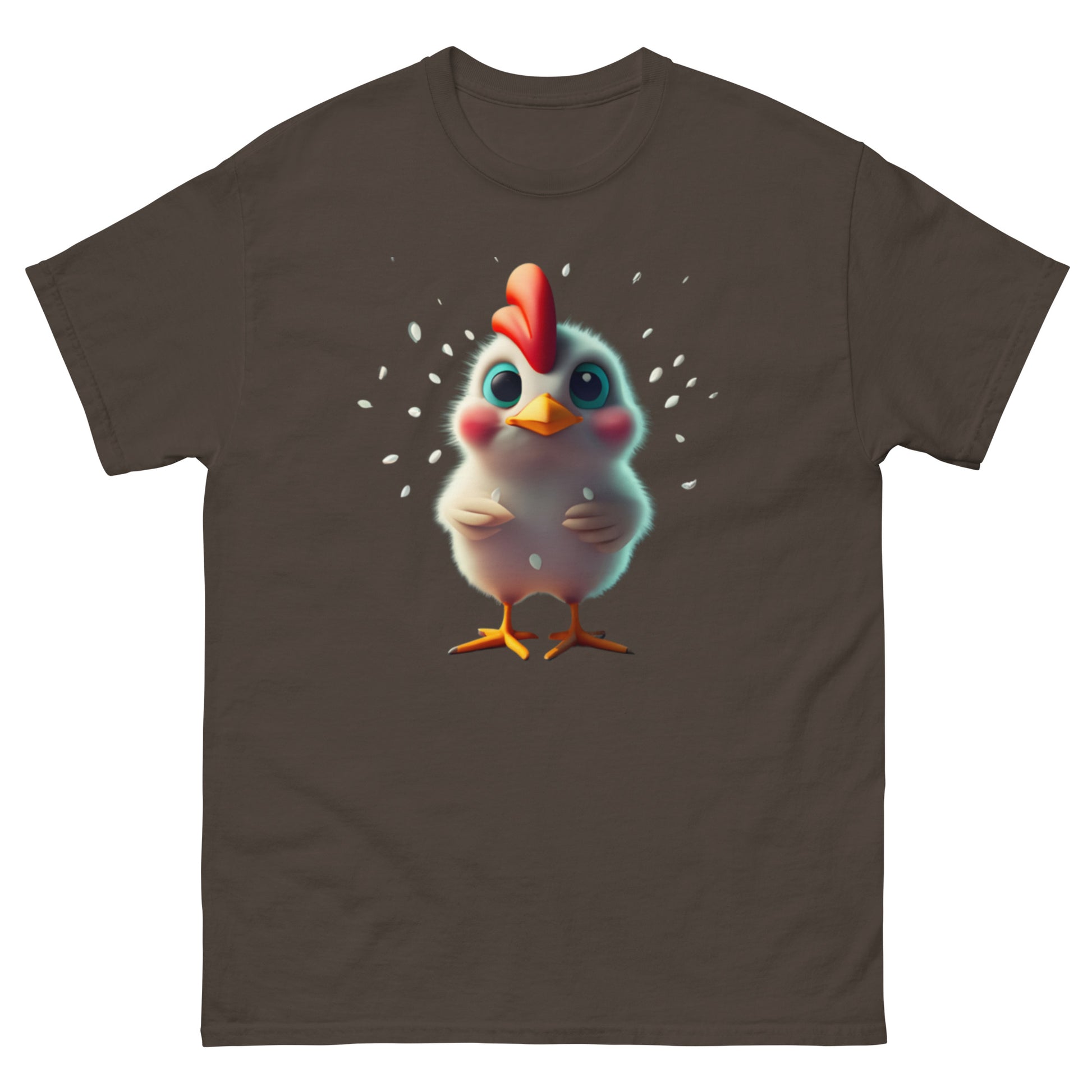 Med en bedårande kyckling som motiv är vår T-shirt en riktig glädjespridare! Den detaljerade illustrationen och de livfulla färgerna ger den en charmig och lekfull look som kommer att få dig att le varje gång du ser den. Oavsett om du är en djurvän eller bara gillar en rolig design, kommer denna T-shirt att bli ett måste i din garderob!