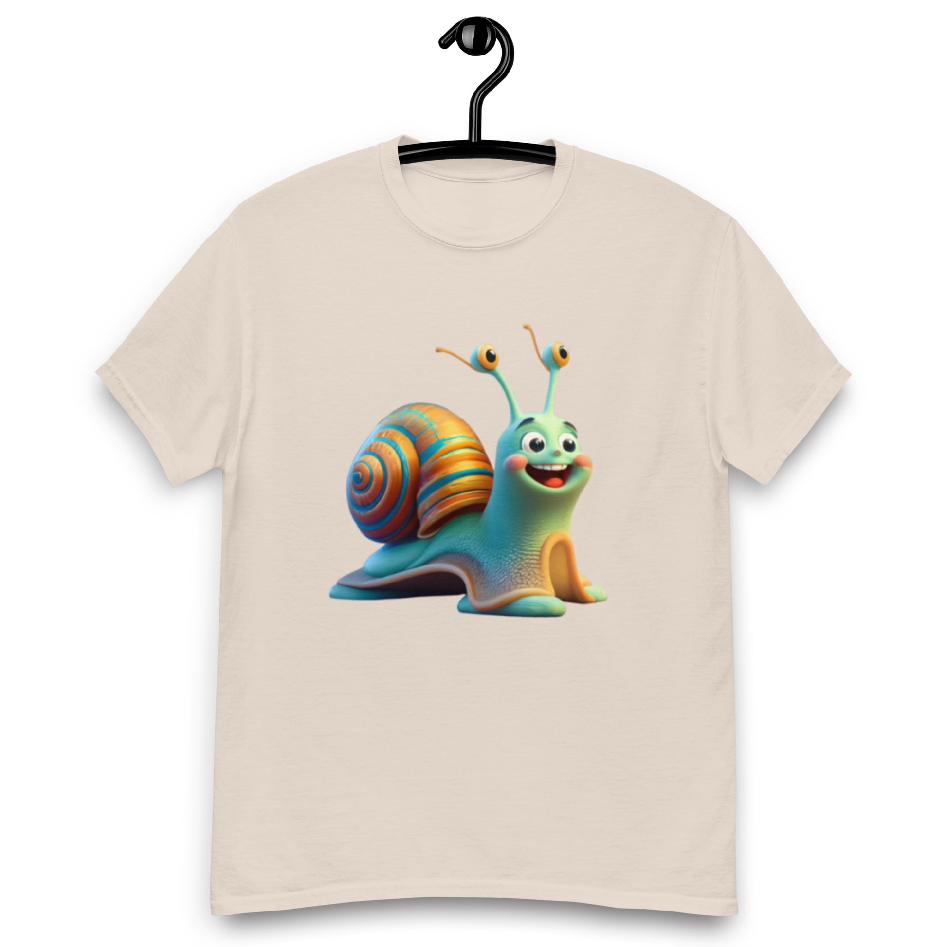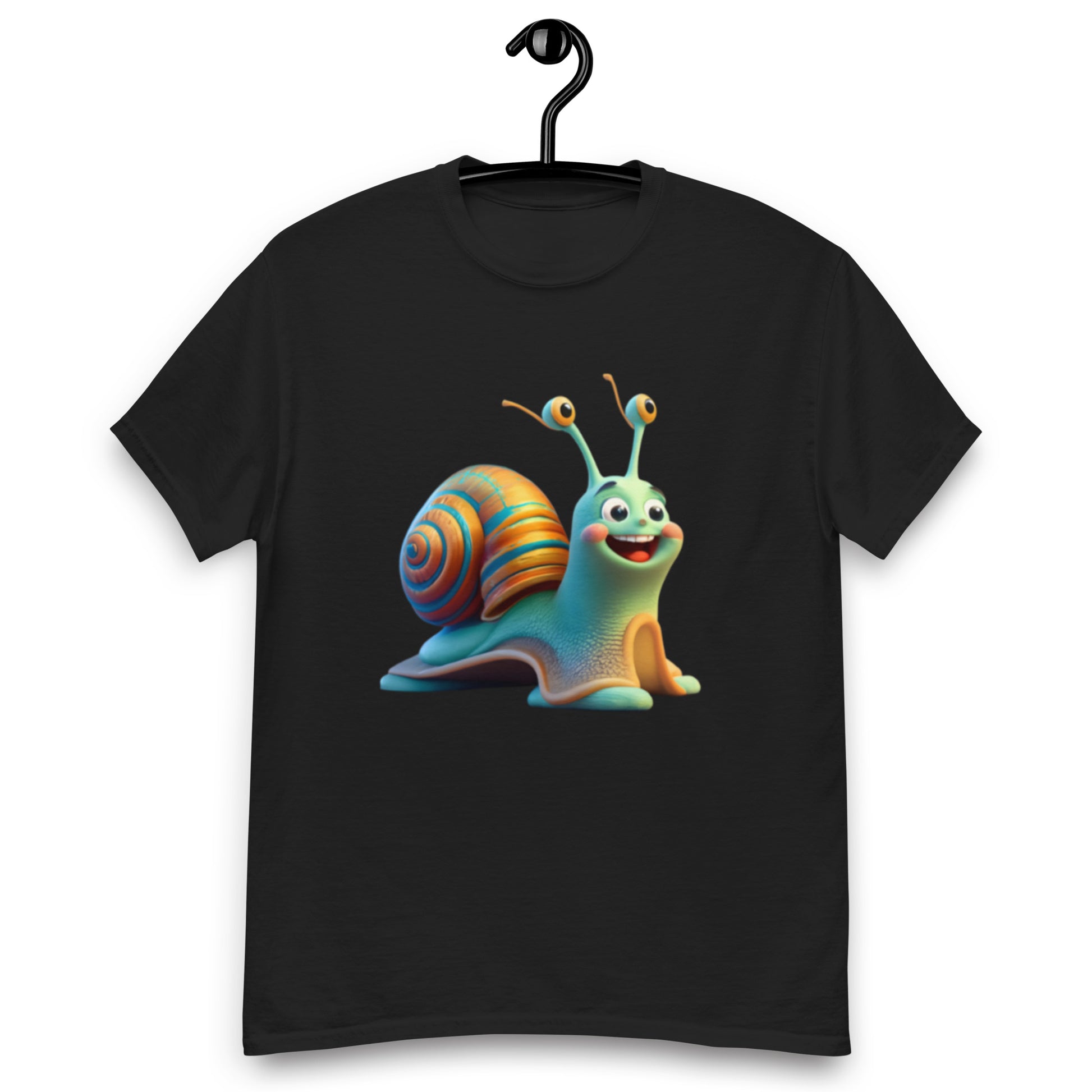 Med en bedårande animerad snigel som motiv är vår T-shirt en riktig glädjespridare! Den detaljerade illustrationen och de levande färgerna ger den en charmig och lekfull look som kommer att få dig att le varje gång du ser den. Oavsett om du är en djurvän eller bara gillar en rolig design, kommer denna T-shirt att bli ett måste i din garderob!